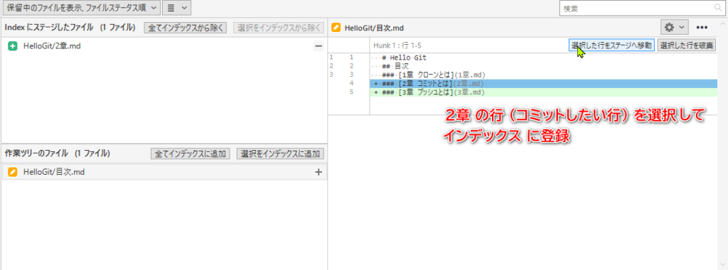 【例】Git のマニュアルを作成していて 2章 と 3章 を作成しました。今回は 2章 だけコミットしたいとします。